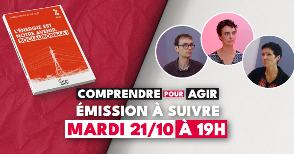 Mardi 21 octobre à 19h, suivez en direct notre émission qui présente le livre d’Attac L’énergie est notre avenir, socialisons-la ! Cet ouvrage propose, de manière percutante et en 80 pages, des pistes pour sortir l’électricité des logiques de marché et mettre en œuvre un véritable service public sous contrôle citoyen
